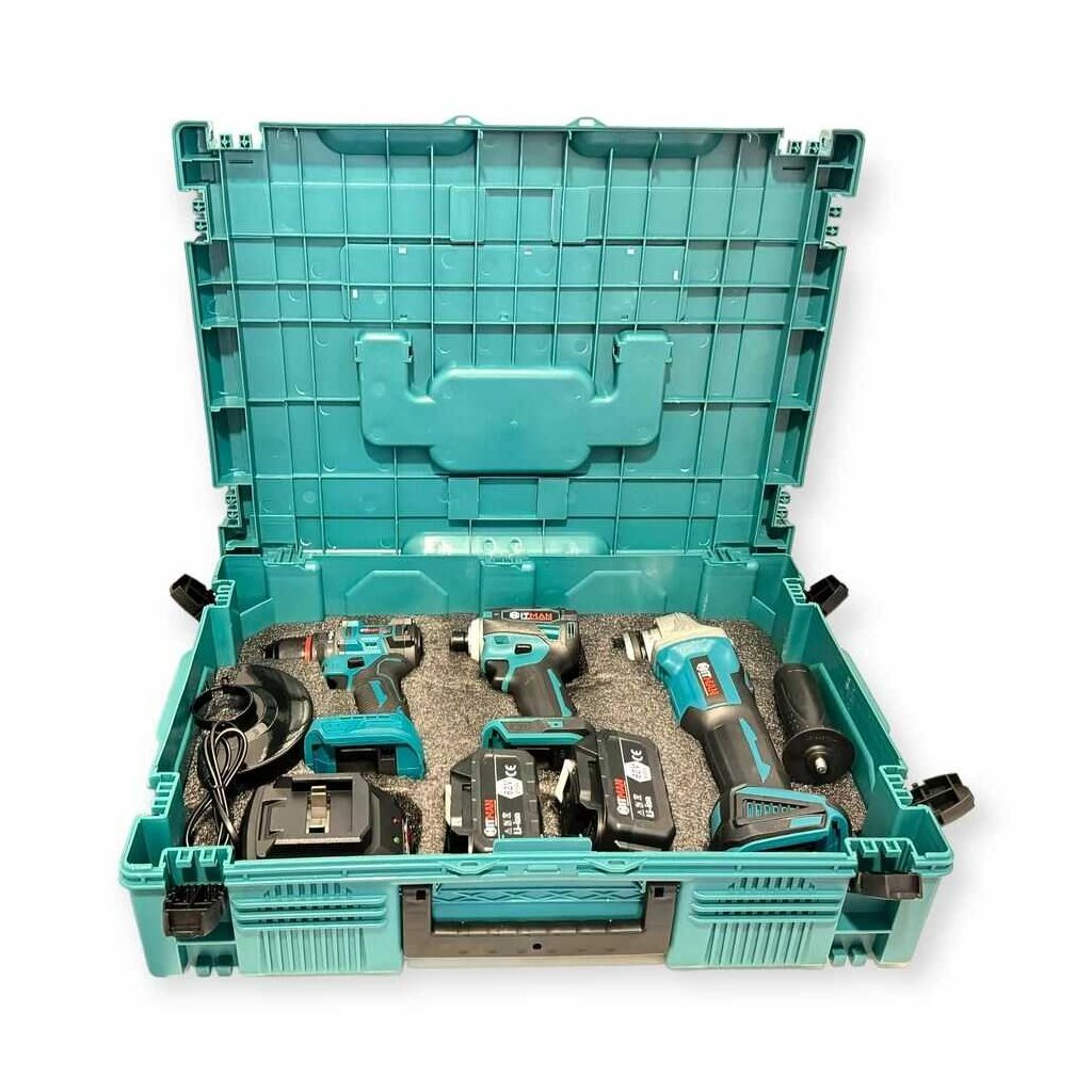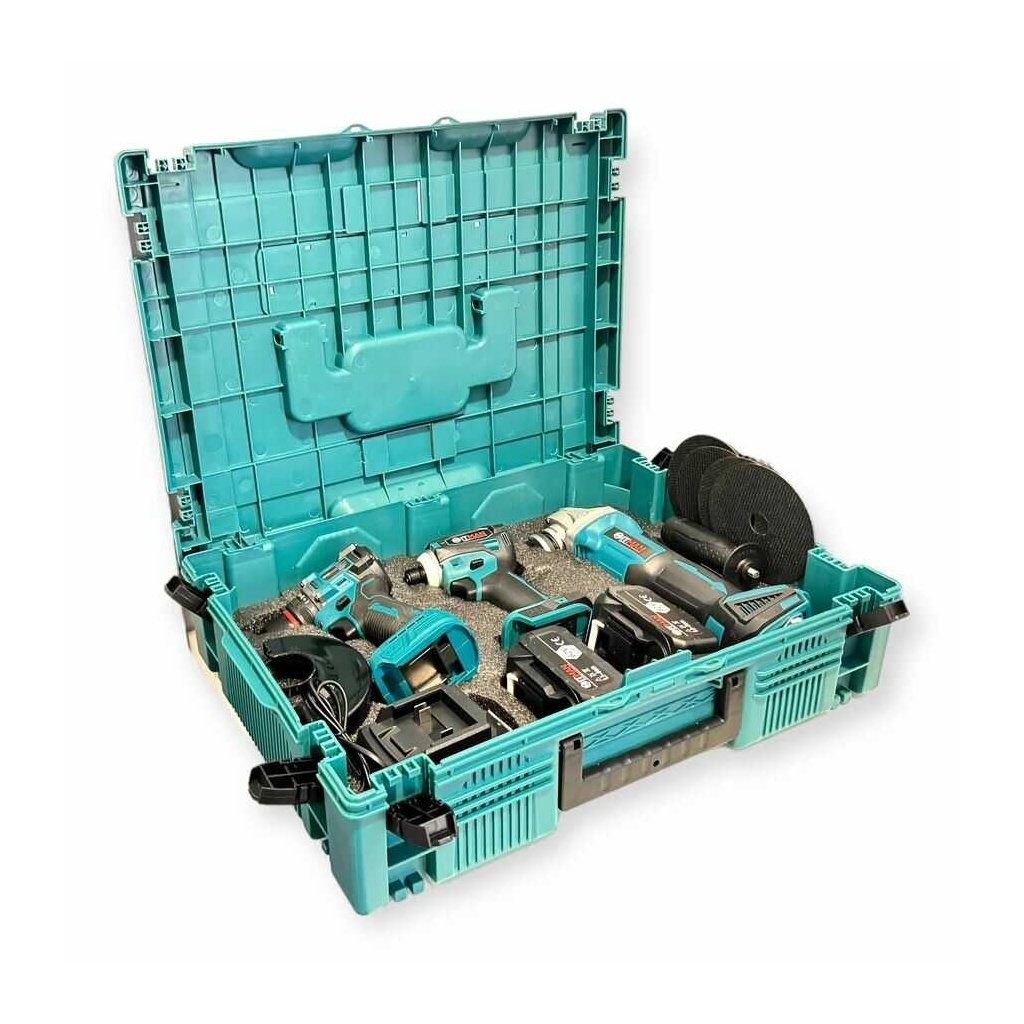 Náradie je vybavené ergonomickým dizajnom pre pohodlné držanie, robustnou konštrukciou pre dlhú životnosť a rýchlonabíjačkou, ktorá minimalizuje prestoje. Celá súprava je uložená v pevnom transportnom kufri, ideálnom na prenášanie a bezpečné skladovanie.