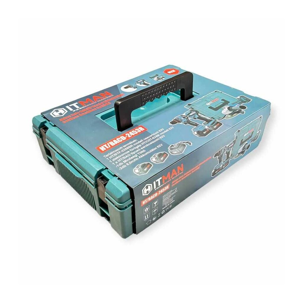 62V akumulátorová sada náradia: príklepová vŕtačka, rázový uťahovák, uhlová brúska 125 mm, 2× batéria, kufor – HT-BACD-2453R