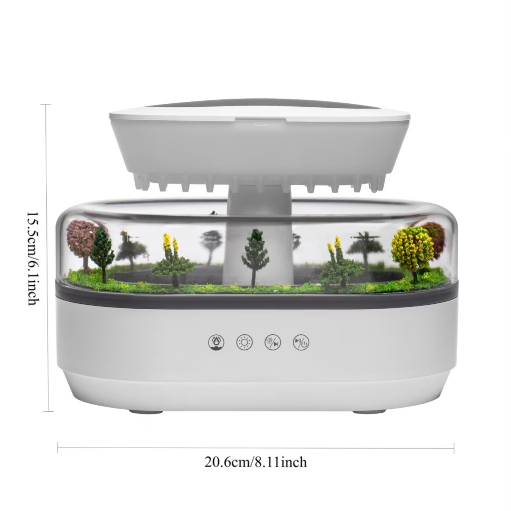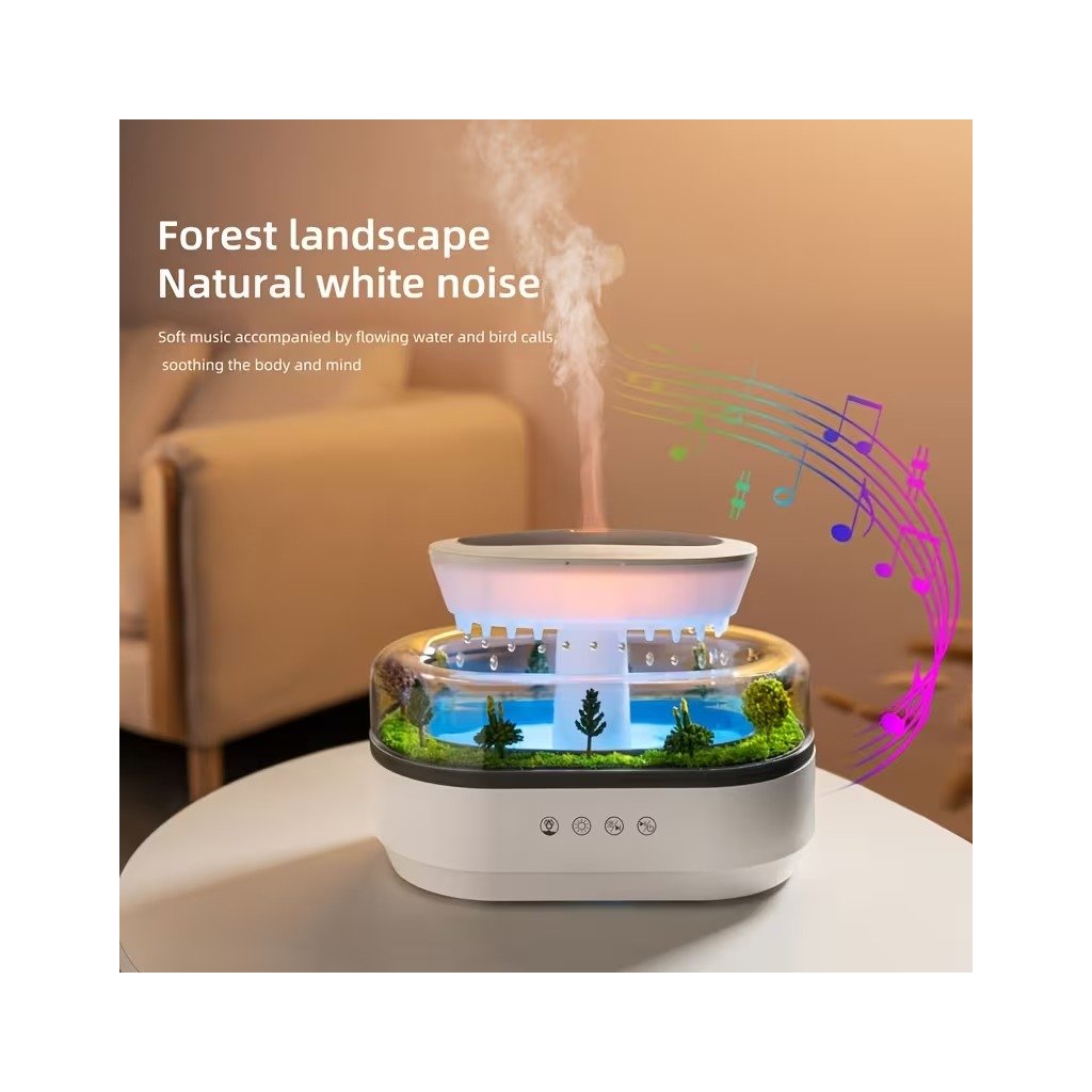 Tento jedinečný aróma difuzér kombinuje zvlhčovanie vzduchu, jemné osvetlenie a dekoratívnu mini krajinu s efektom padajúcich kvapiek. Vďaka priehľadnej konštrukcii vytvára vizuálny dojem malej prírodnej scenérie, ktorá pôsobí upokojujúco a esteticky zároveň.
