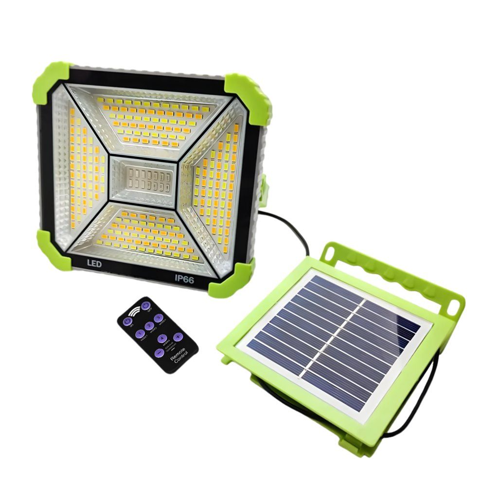 Solárny LED reflektor JLP-2196 s powerbankou – IP65, diaľkové ovládanie, kempingové svetlo