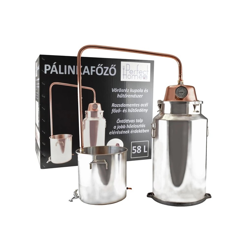 Model Perfect Home 14646 je veľkokapacitná pálenica s objemom 58 litrov, vhodná pre domácich výrobcov, ktorí požadujú stabilnú konštrukciu, kvalitné materiály a spoľahlivý priebeh destilácie. Zariadenie je vyhotovené z nerezovej ocele, doplnené o medenú kupolu, medené spojovacie rúrky a chladiacu špirálu. Súčasťou výbavy je aj teplomer a liatinový podstavec pre vyššiu stabilitu.
