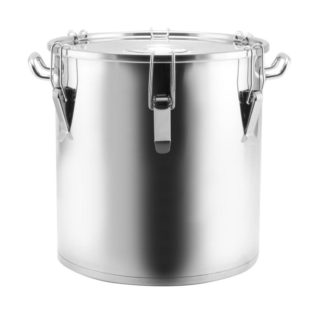 - Nerezová nádoba na potraviny s objemom 40 l a pevnou prackou na uzatvorenie – vhodná na kvas, mušt, vodu, olej či iné potravinárske kvapaliny
