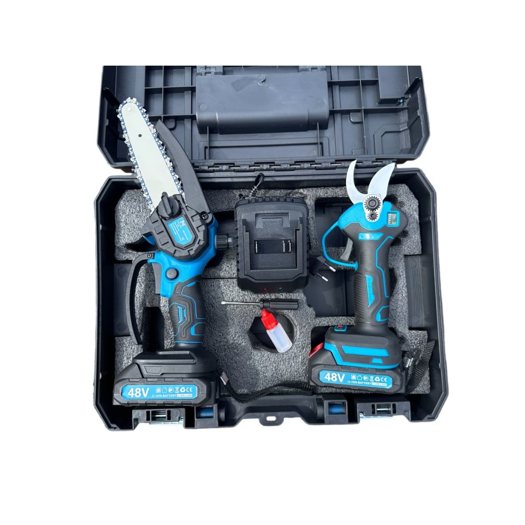| Sada obsahuje | 1x aku pílka 1x aku nožnice 1x nabíjačka 2x akumulátor LI-ON 2000 mAh 1x prakticky kufrík 1x reťaz pre pílku 1x šraubovák 1x L kľúč pre montáž |