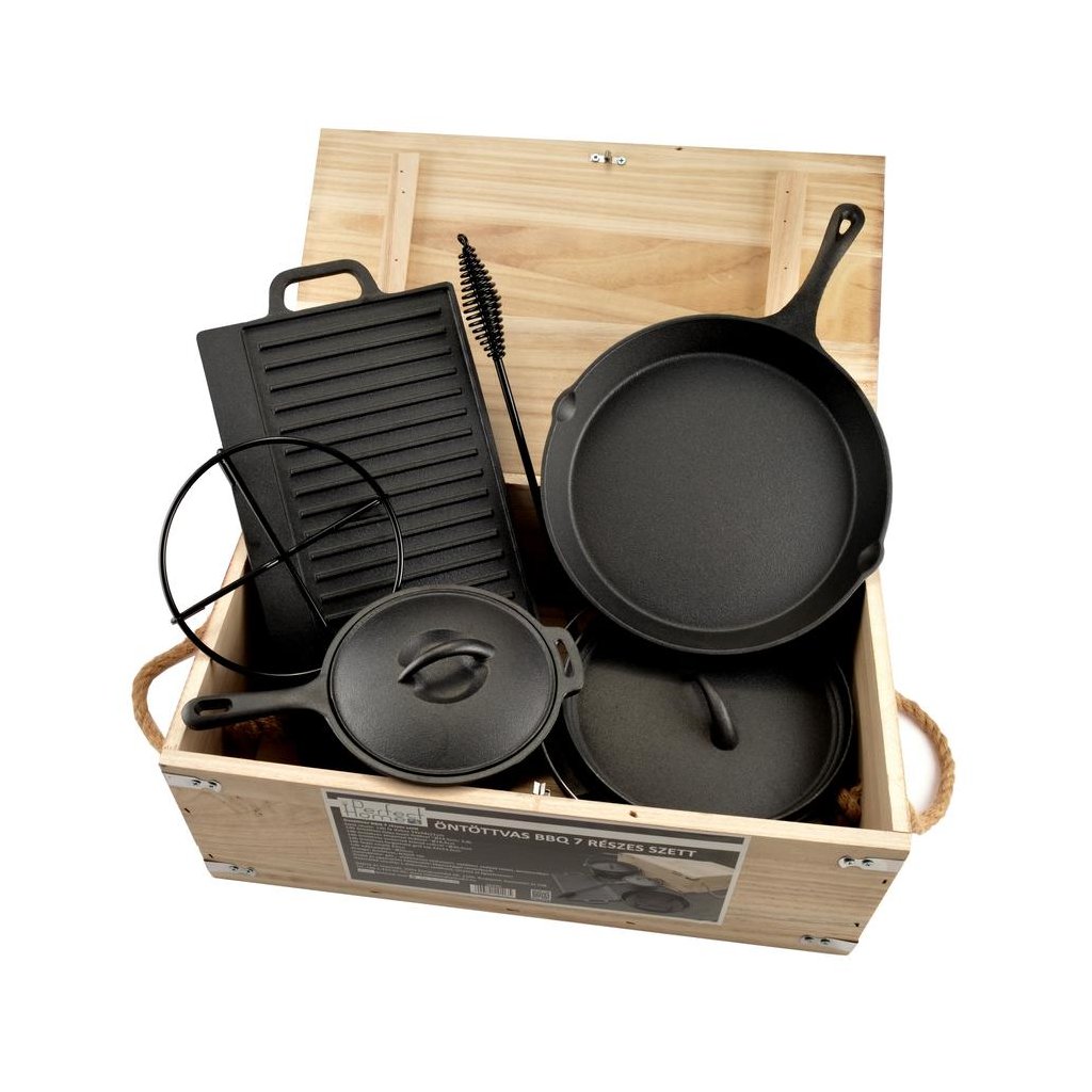 Sada liatinových grilov BBQ s drevenou krabicou 6+1 dielov / sada na pečenie v liatinovej rúre