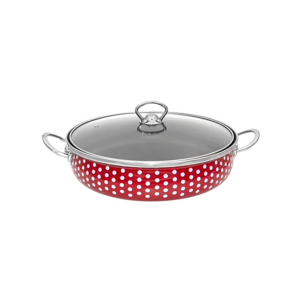 Smaltovaná rajnica s červenými bodkami, 26 cm + sklenená pokrievka